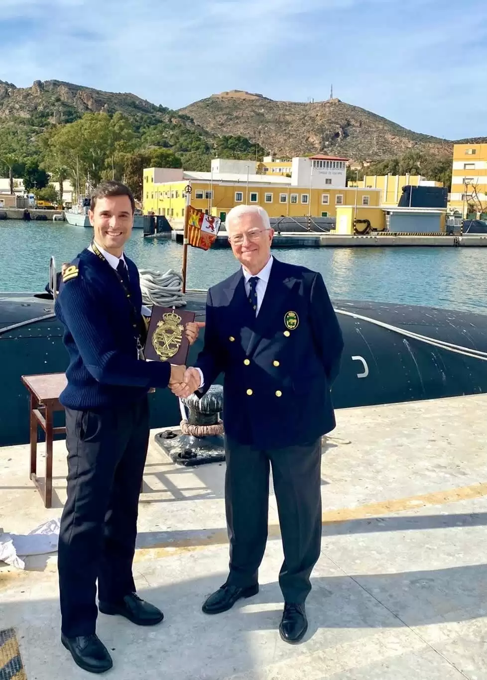 En la visita a la Base de submarinos, fuimos recibidos por el CN Alfonso Carrasco Santos comandante de la flotilla y director de la Escuela de Submarinos, acompañado del CF Jorge Garrido maestre, jefe de Estado Mayor de la Base. Tras el recibimiento posamos en la escalera de la puerta principal, tras lo cual, en el salón de actos, el comandante de la flotilla nos realizó una presentación sobre todos los aspectos del arma submarina. Finalizada la disertación el delegado hizo entrega de la metopa de RAECY al CN Alfonso Carrasco.
